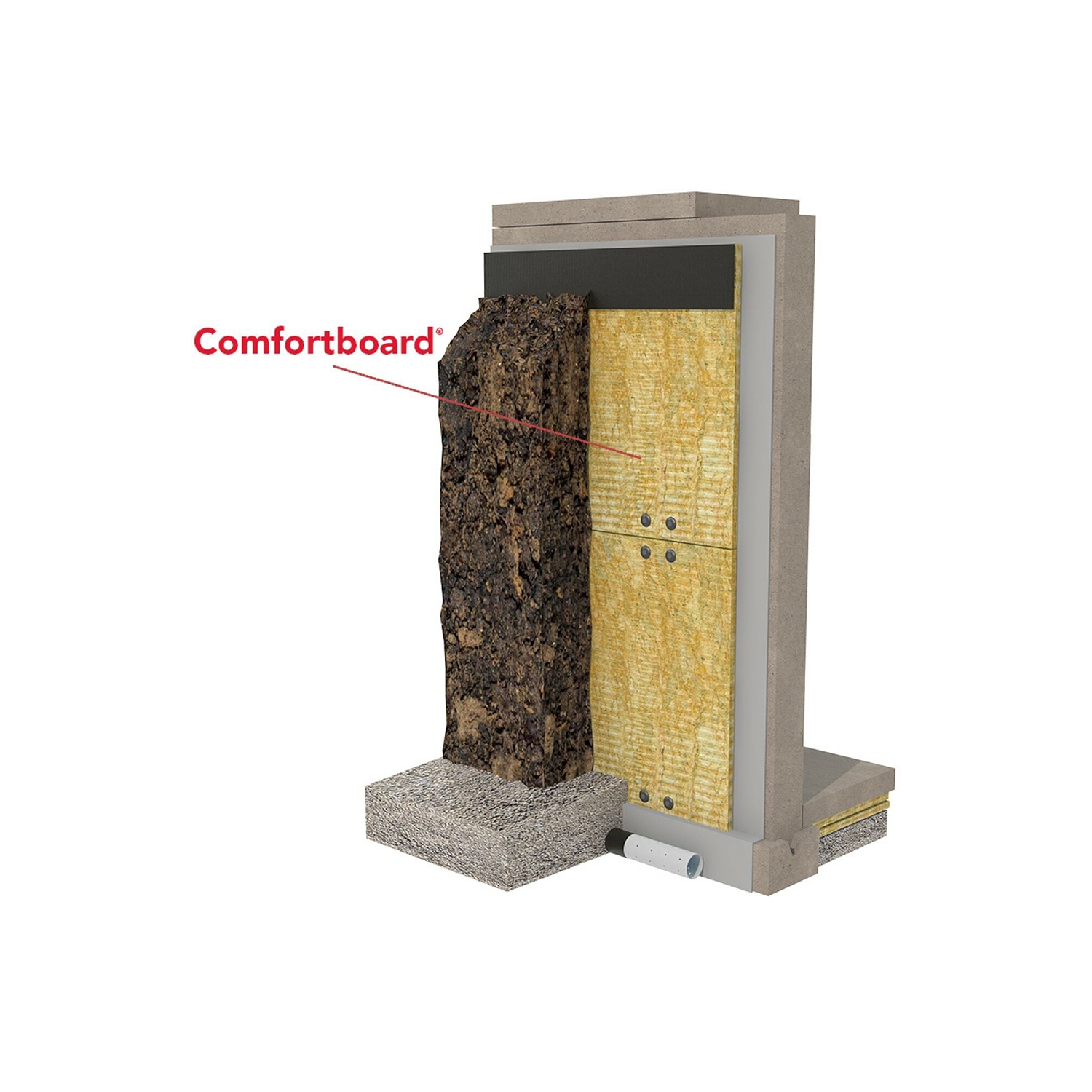 An exterior-insulated wall assembly is simple and robust and has limited inherent risks. It uses Comfortboard as the continuous exterior insulation to maintain consistent thermal resistance, to resist water absorption and to avoid rot, corrosion or mold and fungal growth on or within the insulation. Exterior-insulated wall assemblies are best suited to new construction projects since they require access to the exterior of the foundation wall.